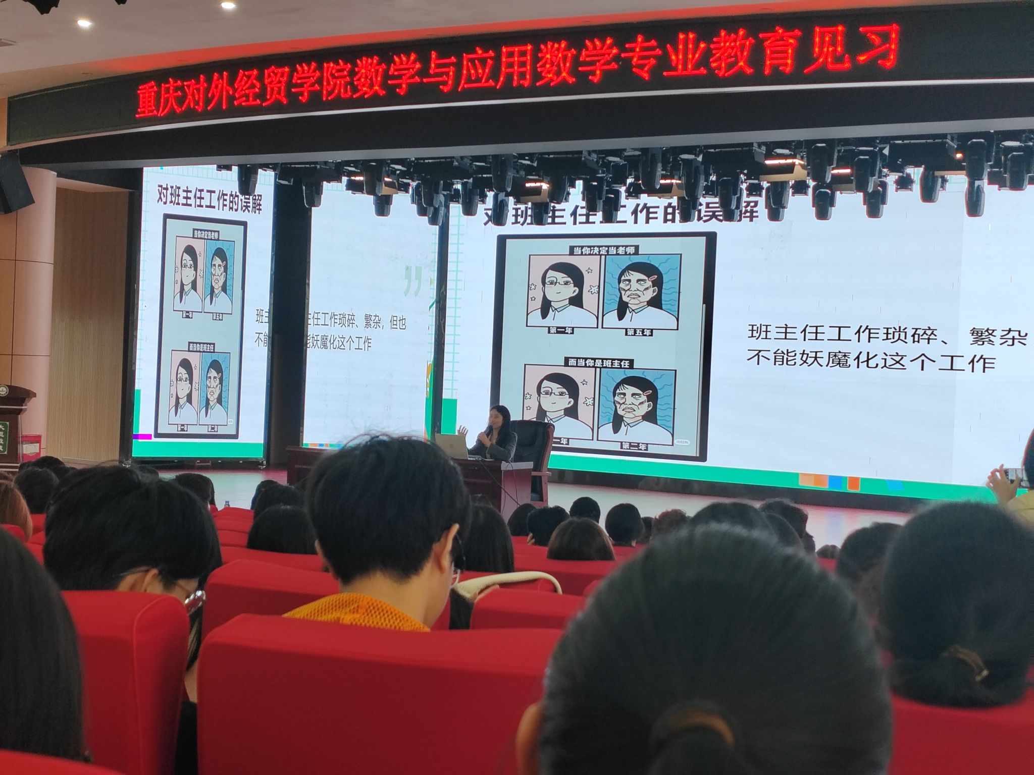 随后,颜老师以“倾心教育 静待花开”为主题开展讲座。内容涵盖了教育理念、教学方法、学生管理等多个方面。颜教师结合自己的教学实践,分享了如何用心关爱学生、如何激发学生的学习兴趣、如何培养学生的自主学习能力等宝贵经验。讲座内容深入浅出,既有理论高度,又有实践指导,使学生们受益匪浅。