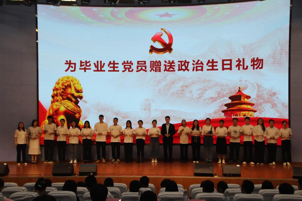 组织员冷震北为转正党员赠送政治生日礼物。紧接着,毕业生党员代表张林发言,他表示作为学生党员,更要肩负起历史的责任和担当,在习近平新时代中国特色社会主义思想引领下奋勇前进。