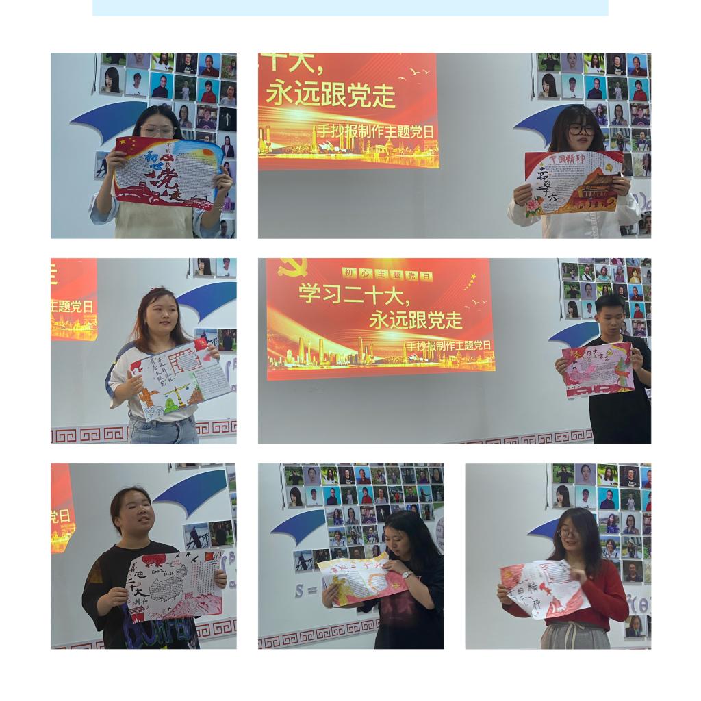 初心支部开展以“学习二十大,永远跟党走”为主题的手抄报主题党日,切实将党员们的思想和行动统一,内化于心、外化于行,奋进新征程,建功新时代。党员们在创作手抄报的过程中再次学习了党的二十大精神,激发党员们的爱国热情,增强党员们的民族自信心和历史使命感,将爱国热情转化为积极主动、自觉报效祖国的动力。在杨凯书记主讲的“学党史”党课上,重温建党精神,缅怀先烈,珍惜我们来之不易的幸福生活,我们要不畏艰险,实事求是,与时俱进,开拓进取,努力成长为坚定不移听党话、跟党走,堪当民族复兴重任的时代新人!