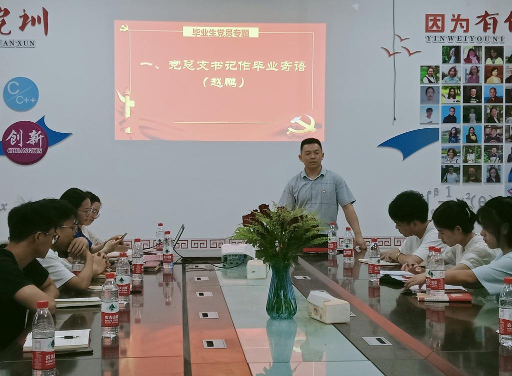 随后,党总支书记赵鹏为毕业生党员们赠予毕业祝愿,并表示:中国共产党是中国工人阶级的先锋队,是中国人民和中华民族的先锋队,党员同志们要不忘初心,牢记使命,建功新时代,打造炫彩青春。毕业生党员代表雷胜函同志表达了对母校、党组织培养的感恩之情,并表示定将不忘师恩,在新的岗位上充分发挥党员模范带头作用,以优异的成绩回报母校、回报祖国。非毕业生党员代表何镘同志表示要向毕业生党员学习,不断提升自我,并送出对毕业生党员们的美好祝福。