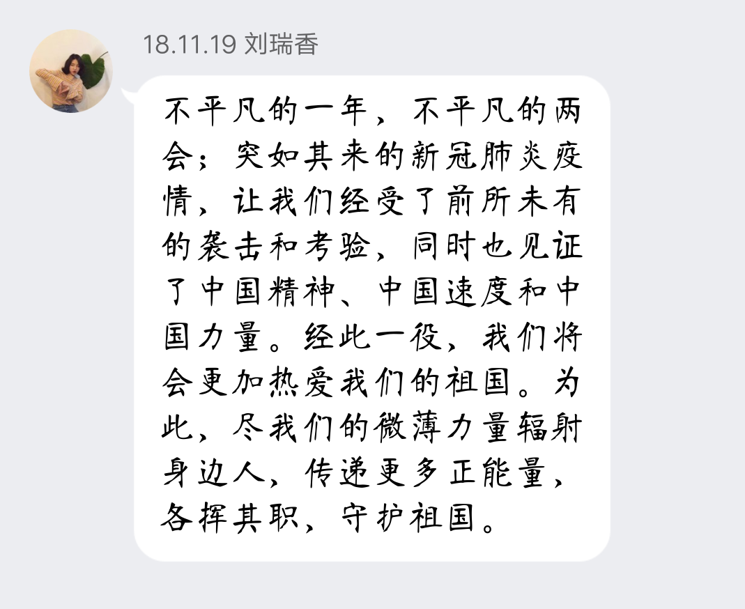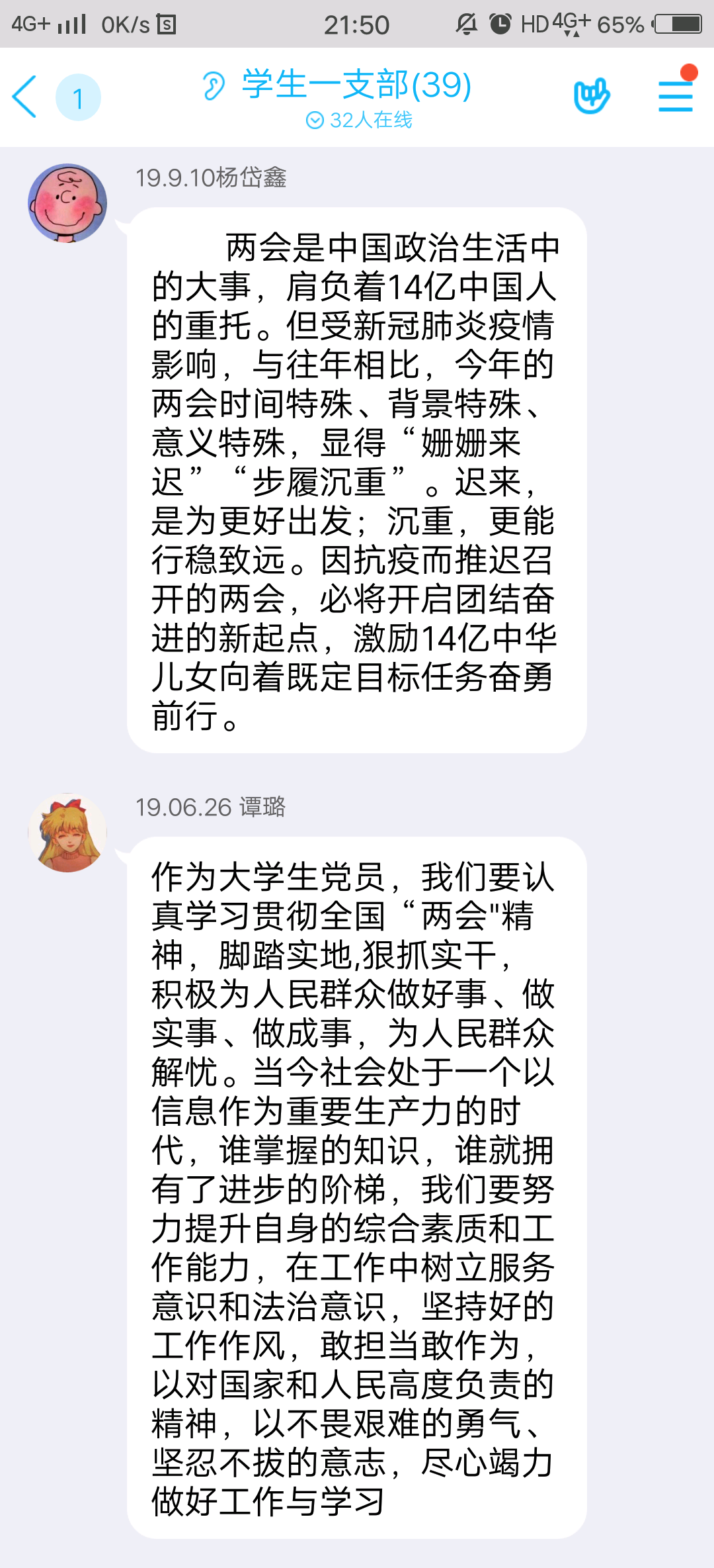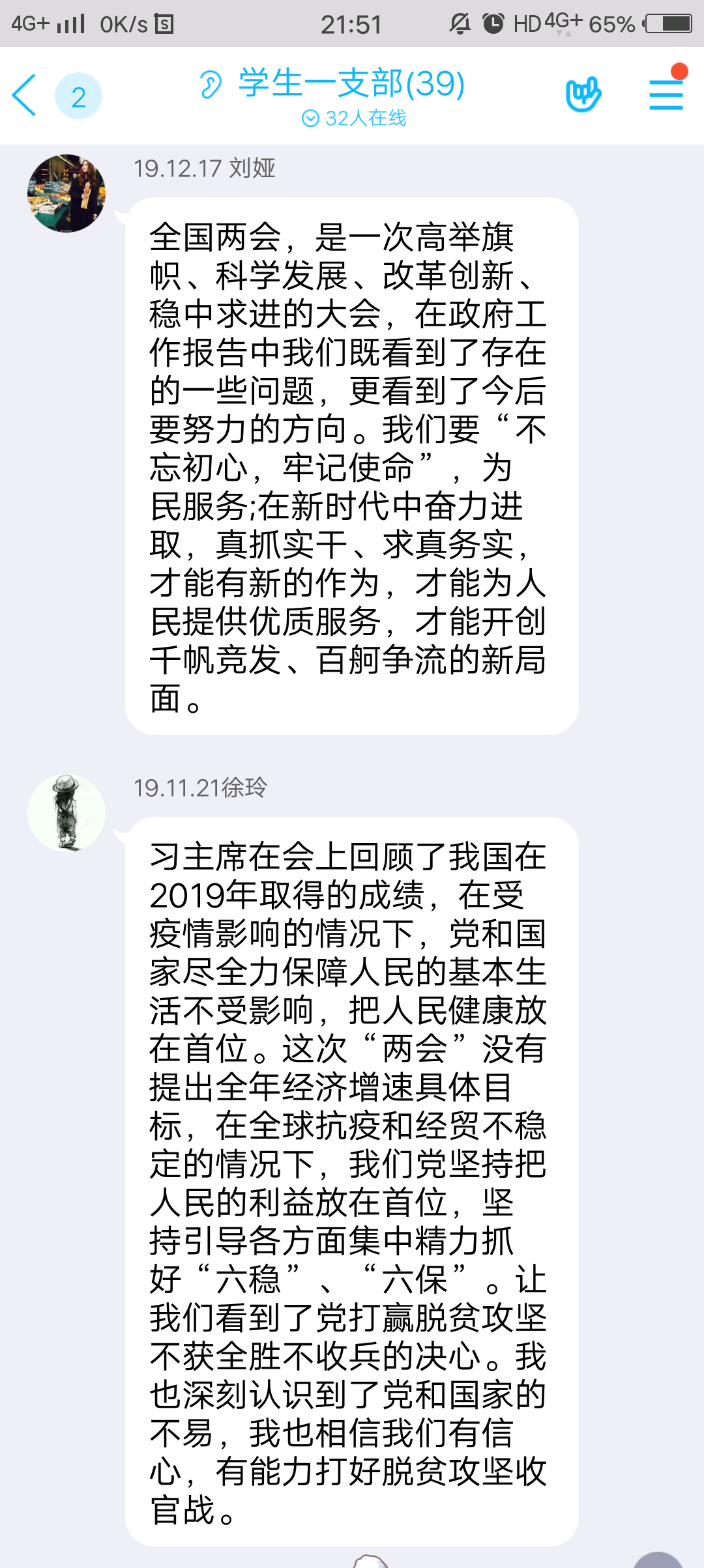 最后,全体党员结合支部书记徐燕同志所讲内容踊跃发言,进行了热烈的线上学习探讨,并表示:此次“两会”为党和国家抢占机遇、谋求发展、提振信心、汇聚力量、指明方向;作为大学生党员,我们要认真学习贯彻全国“两会"精神,狠抓实干,积极为人民群众做好事、做实事、做成事,在工作中树立服务意识和法治意识,坚持好的工作作风,敢担当敢作为,以对国家和人民高度负责的精神,以不畏艰难的勇气、坚忍不拔的意志,尽心竭力做好工作与学习!