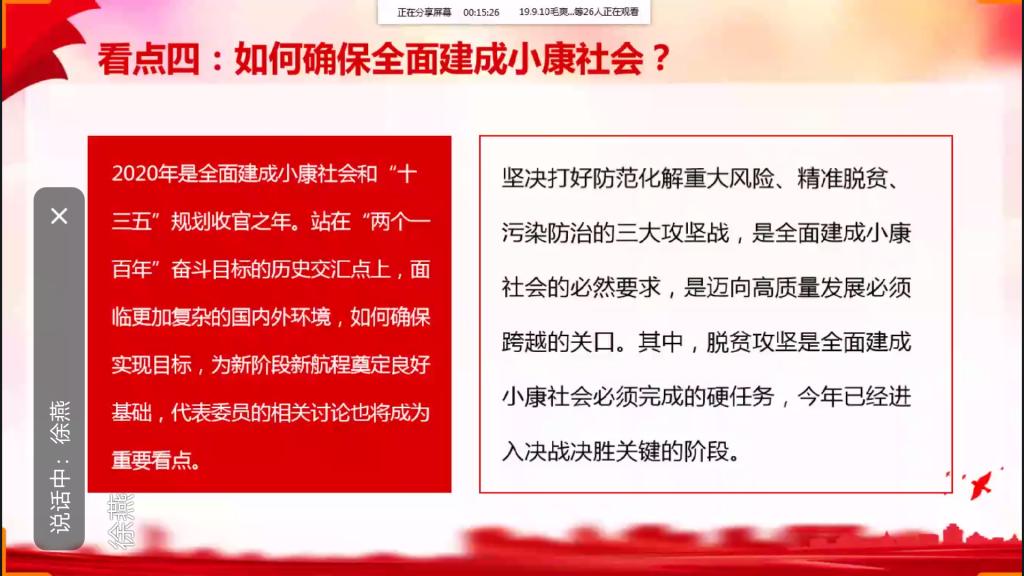 首先,全体党员线下自学视频“十三届三次会议新闻发布会”“全国政协十三届三次会议”及文件《政府工作报告》,并整理思想心得。接着,支部书记徐燕同志通过QQ群视频会议,从疫情防控、经济社会发展预期目标、脱贫攻坚、全面建成小康社会、民生保障、民法典保障人民权益、国外环境七个方面对国内外的现状进行了分析,还强调2020年是全面建成小康社会和“十三五”规划收官之年,也是脱贫攻坚决战决胜之年,突如其来的新冠肺炎疫情给完成既定目标任务带来挑战,要增强“四个意识”,坚定“四个自信”,做到“两个维护”,坚持党的领导、人民当家作主、依法治国有机统一。