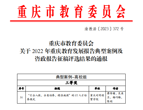 近日,重庆市教育委员会发布《重庆市教育委员会关于2022年重庆教育发展报告典型案例及咨政报告征稿评选结果的通报》(渝教函〔2023〕372号)。我院蒋传健、吴亚兰、杨巧梅、陈娟撰写的《“引企入教、分类培养、精准施教”的IT人才培养模式》荣获典型案例高校组三等奖。