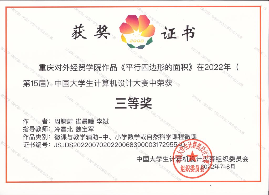 2022年(第15届)中国大学生计算机设计大赛“软件应用与开发”和“微课与教学辅助类”的决赛分别在东北大学、山东大学落下帷幕,我校共有5支队伍参加比赛;最终,2支队伍获得全国二等奖,3支队伍获得全国三等奖。
