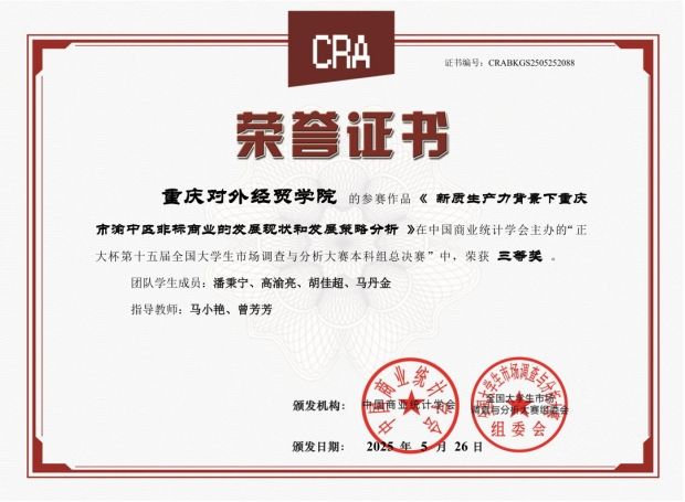 近日,“正大杯”第十五届全国大学生市场调查与分析大赛落幕。我校由数学与计算机科学学院组织学生参赛,最终荣获国家三等奖1项,重庆市一等奖4项、二等奖3项、三等奖4项。